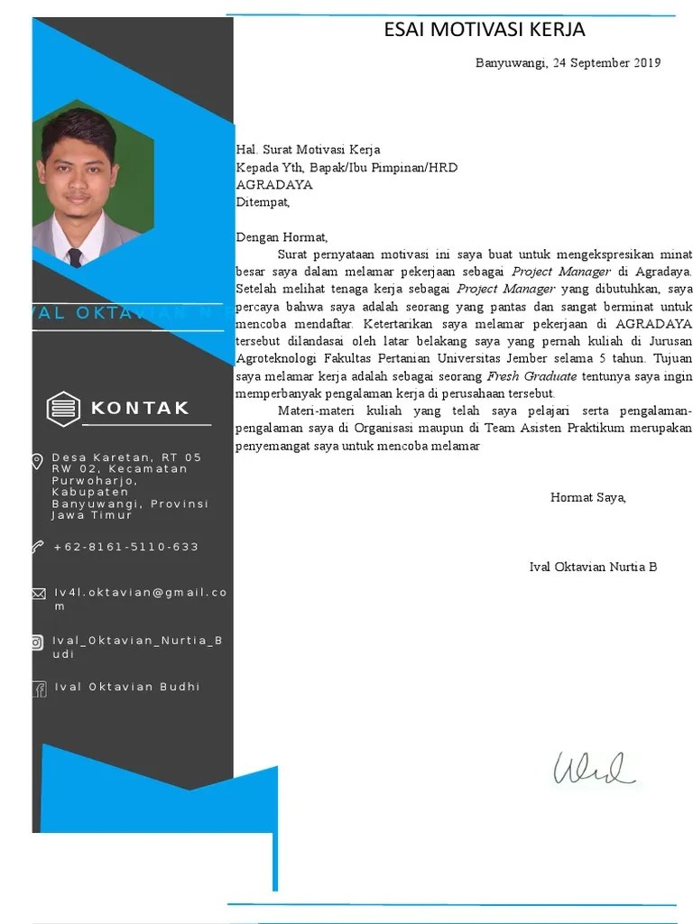 Surat lamaran kerja biasanya dikirimkan untuk melamar sebuah posisi kerja di suatu perusahaan. Bingung cara menyusun citra diri dalam esai pendek? Bagi sebagian orang membuat esai membutuhkan usaha yang ekstra. Anda bisa belajar dari contoh motivation letter melamar kerja. Ambil 1 contoh gaya dan alur penulisan .